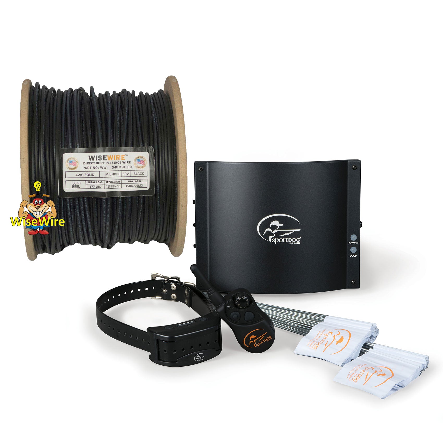 Package contents: Collar Receiver on Black 1 Inch Collar Strap, Containment Transmitter, Remote Transmitter, 1,000 Feet of 18-Gauge WiseWire®, 100 Boundary Flags, Charging Adapters, Standard Contain Points, Long Contact Points, Lanyard, Test Light Tool, and Basic Training Manual and DVD.